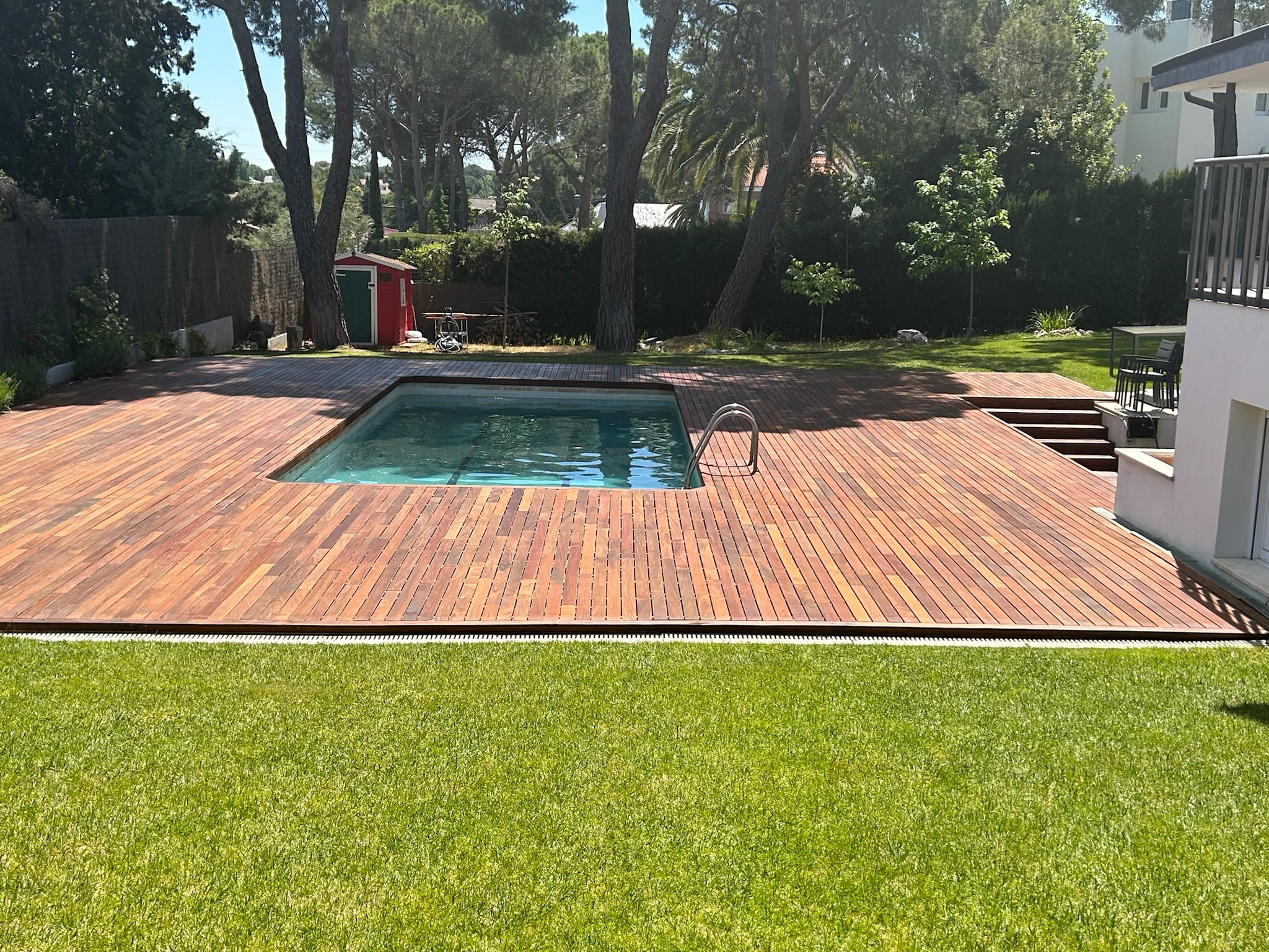 Instalación, lijado y barnizado de tarima de exterior para delimitar una piscina. El trabajo se ha realizado con la instalación previa de la tarima de exterior, seguido de un lijado para eliminar impurezas para finalizar aplicando un barniz resistente al agua.