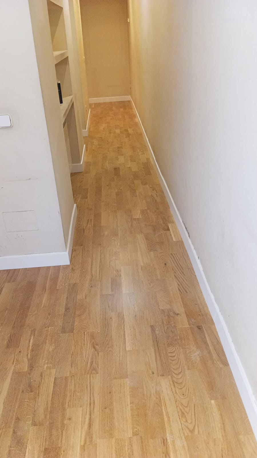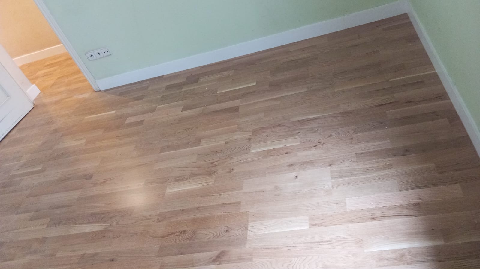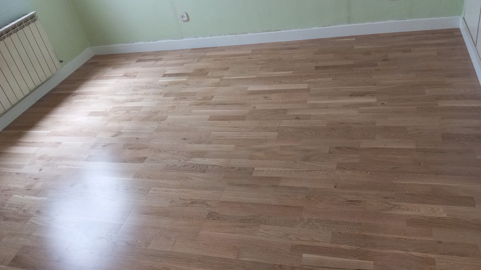 Trabajo de instalación de tarima flotante de roble de 3 lamas, aplicando un barniz con acabado satinado.