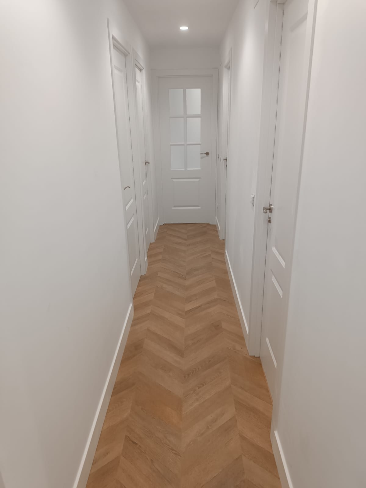 Instalación de tarima flotante laminada en espiga con rodapié y puertas blancas lacadas macizas.